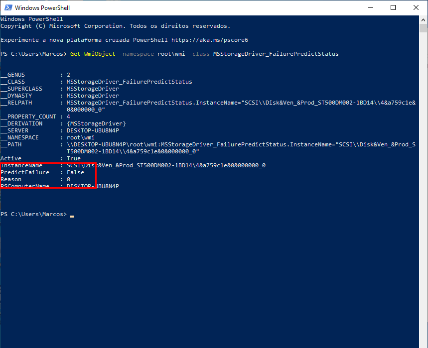 Na tela acima temos um resultado do teste que deu um “PredictFailure” Falso, ou seja, provavelmente não ocorrerá falhas em um futuro próximo – Eu confio nisso por uns 30 dias.